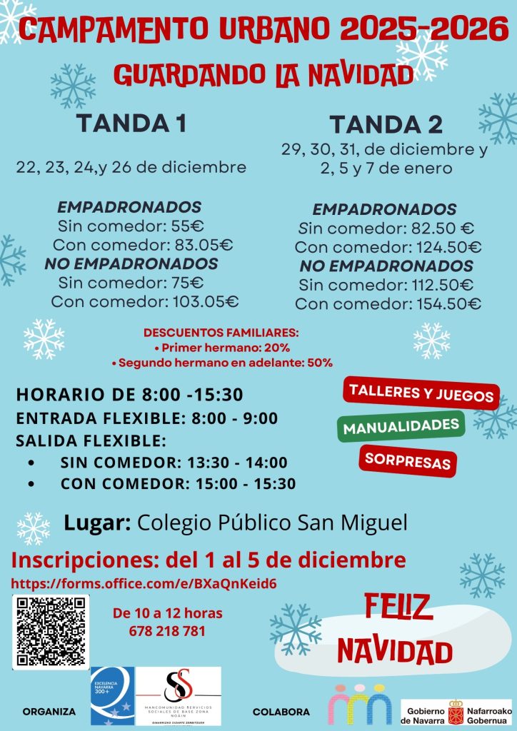 La sede del campamento será en el colegio público San Miguel, de Noain, y las inscripciones pueden realizarse de manera telefónica en el número 678 218 781, del 1 al 5 de diciembre, de 10:00 a 12:00 horas, y en la web http://www.campamentosdenoain.wordpress.com.