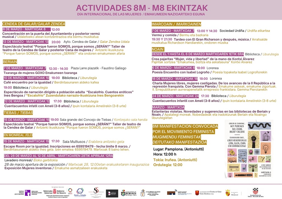 Con motivo de la celebración del 8 de marzo, Día Internacional de las Mujeres, la Mancomunidad del Servicio Social de Base de Zona Noain ha programado los siguientes actos: