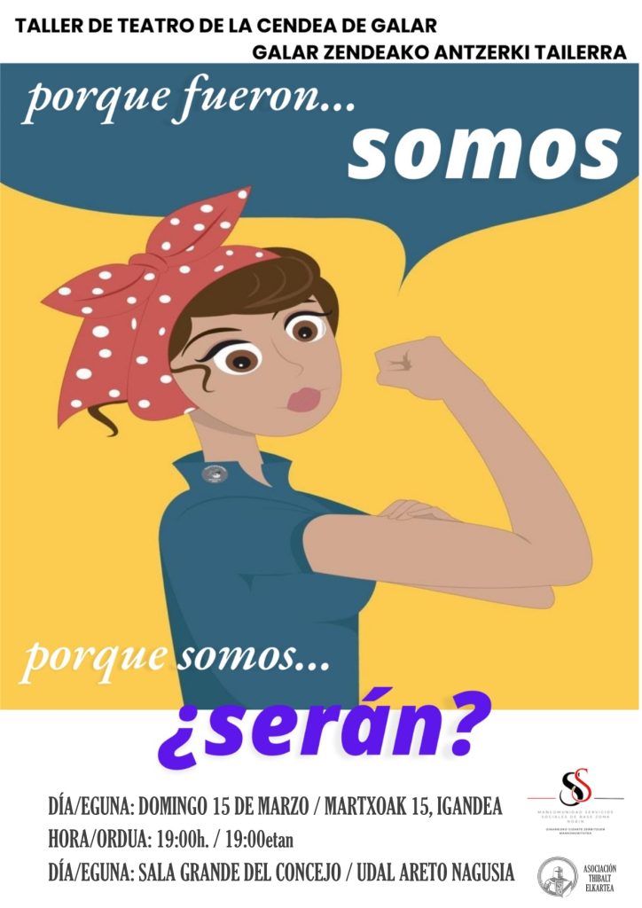 - Domingo, 15 de marzo: a las 19:00 horas, en la Sala Grande del Concejo de Tiebas, espectáculo teatral ‘Porque fueron SOMOS, porque somos ¿SERÁN?’, a cargo del Taller de Teatro de la Cendea de Galar.