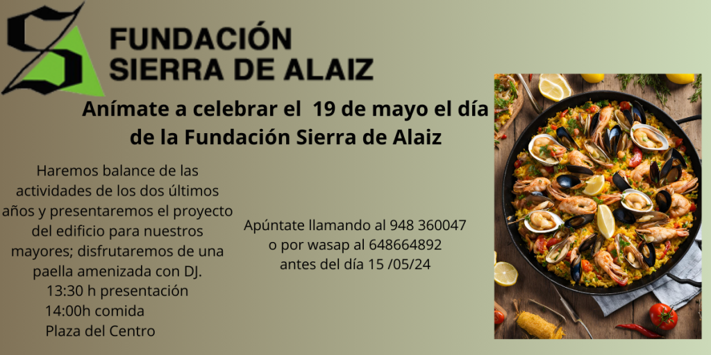 El domingo 19 de mayo, la Fundación Sierra de Alaiz celebrará una jornada festiva donde se hará balance de las actividades de los dos últimos años y se presentará el proyecto del edificio para los mayores de la localidad. Además, se disfrutará de una paella amenizada con DJ, para lo que es necesario apuntarse en el teléfono 948 360047 o por whatsapp, en el teléfono 648664892, antes del 15 de mayo.