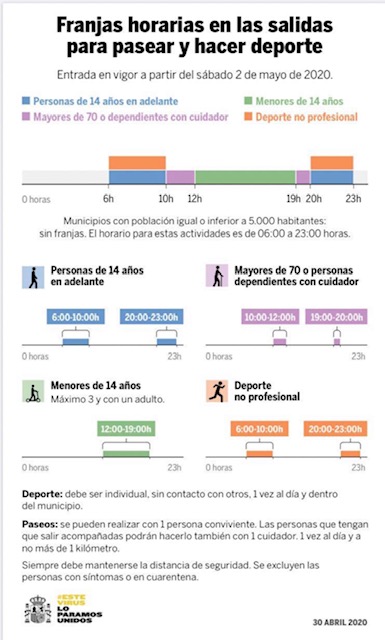 Según ha indicado el Gobierno de España, desde el 2 de mayo entró en vigor la nueva normativa con franjas horarias en las salidas para pasear y hacer deporte, en el caso de municipios de más de 5.000 habitantes.
